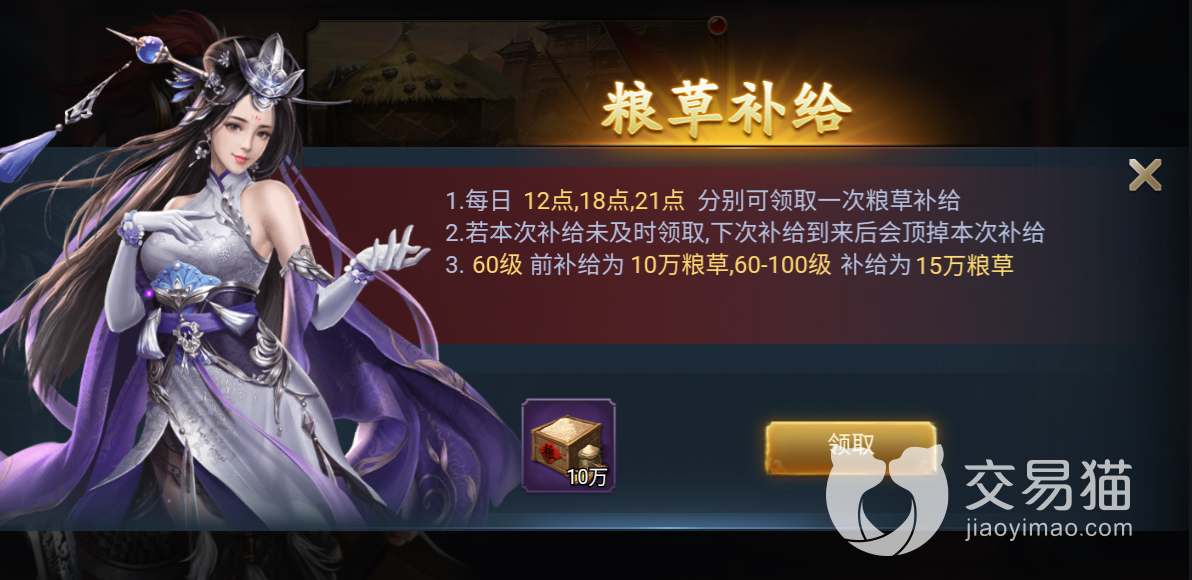 粮草补给的话自然不必多说,通过主界面左上角的“事件”即可进入,这个东西每天打列传都需要用到,里面每天可以领几十万的粮草,所以一定要记得领取一下。