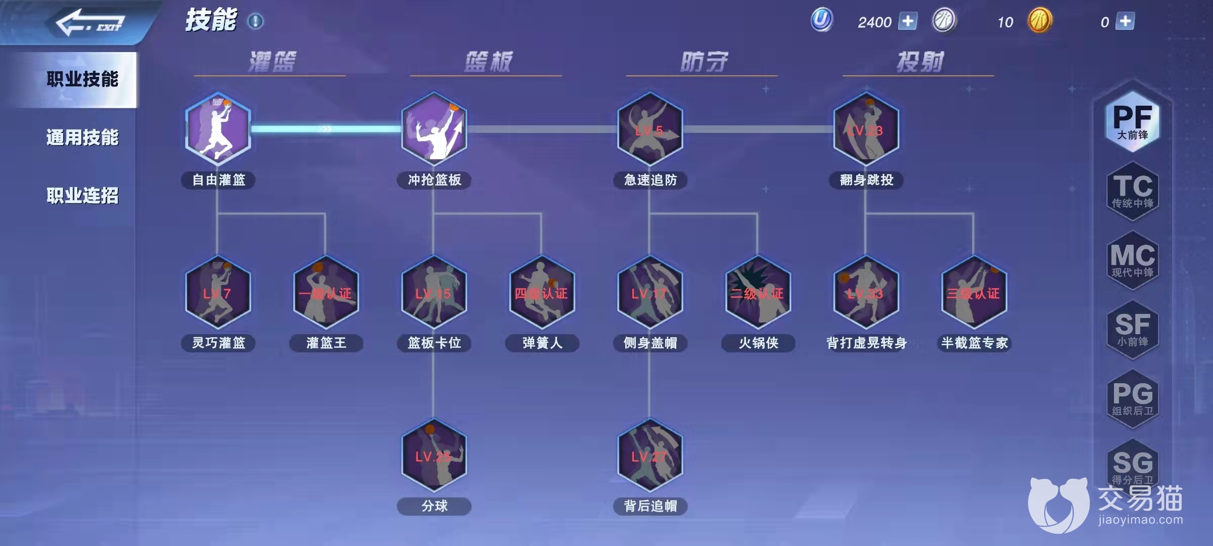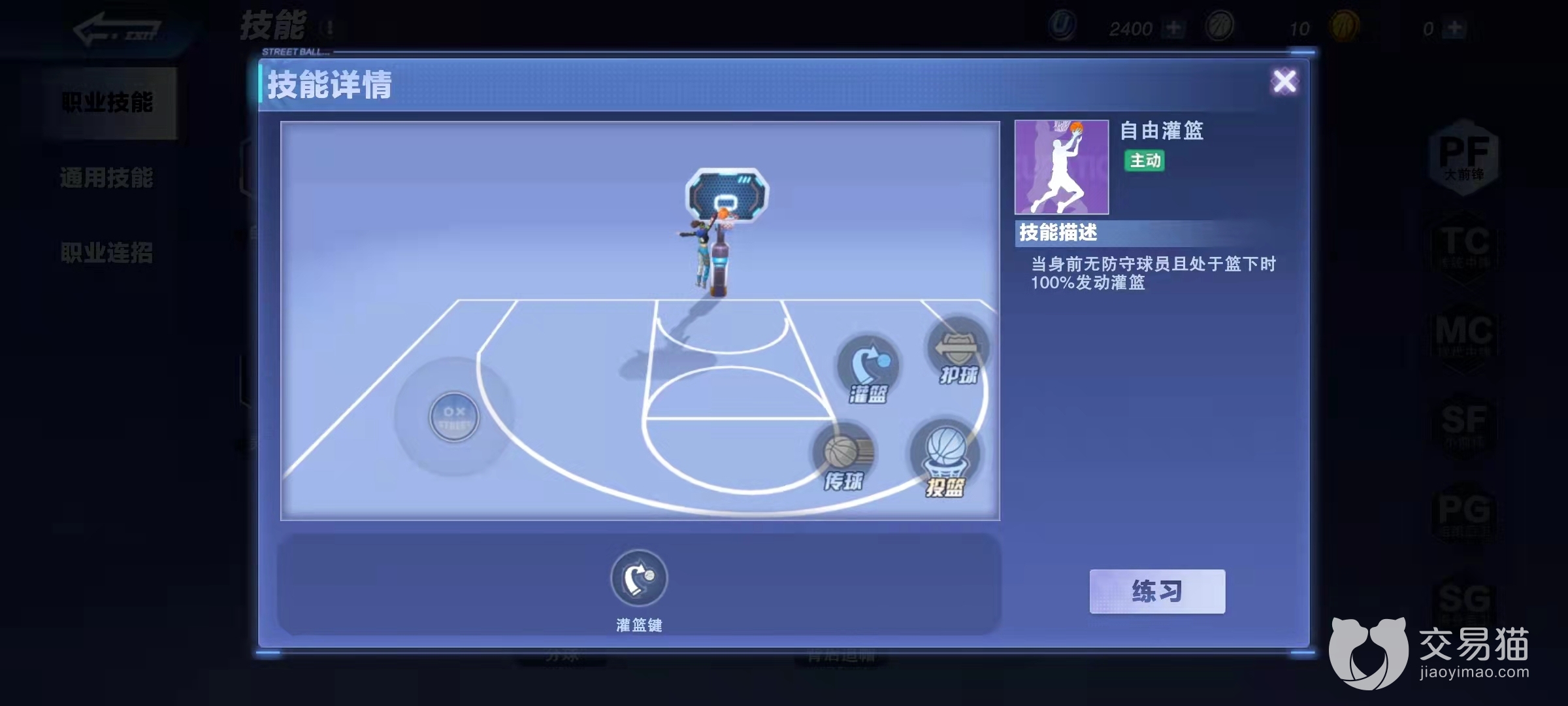 游戏里扣篮首先需要你解锁一个技能,这个技能的名字叫“自由灌篮”,对于大前锋和中锋来说是第一个就能解锁的技能,所以建议想扣篮的朋友选择这两个职业,因为能早点解锁扣篮。自由扣篮的效果如下图所示:可以让你在无人防守时百分百扣篮。