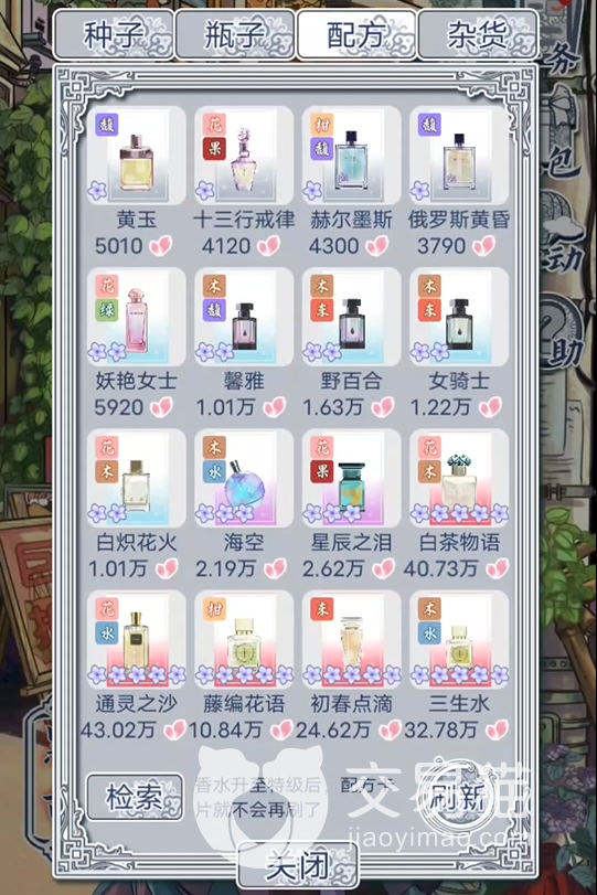 以上就是有关于花与香水与猫香水大全的全部内容了,在游戏中玩家们在研制出香水之后可以多进行制造将该香水的熟练度升满还可以提升该香水的等级。