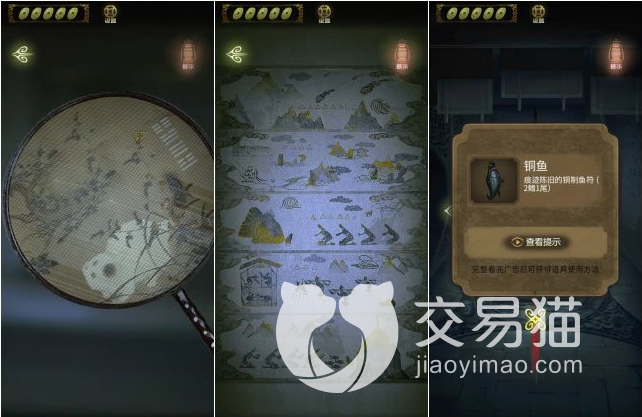 进入暗门之后获得道具和线索,将猫凳放在指定的位置上面,然后会出现一道暗门,搜索获得隐藏的线索和新场景。获得扇子之后可以得到卦象线索,壁画上面也有线索,猫凳下面获得道具。进入暗门之后到达负一层发现解密场景,然后完成游戏获得道具,在墙壁上将龙须道具放上去,这里需要消耗六个铜鱼道具,通过线索打开负二层。