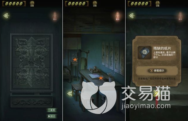 玩家们在结束对话之后就可以对当前场景进行探索,发现桌子上面的香炉和带有铜钱的纸,在床脚发现拼图游戏,完成游戏之后到右侧在桌子上面获得道具,然后在花盆里获得铜钱。墙上可以发现残缺的画作,将铜钱拼图上去获得线索,然后将铜钱放在桌上完成游戏打开暗门。