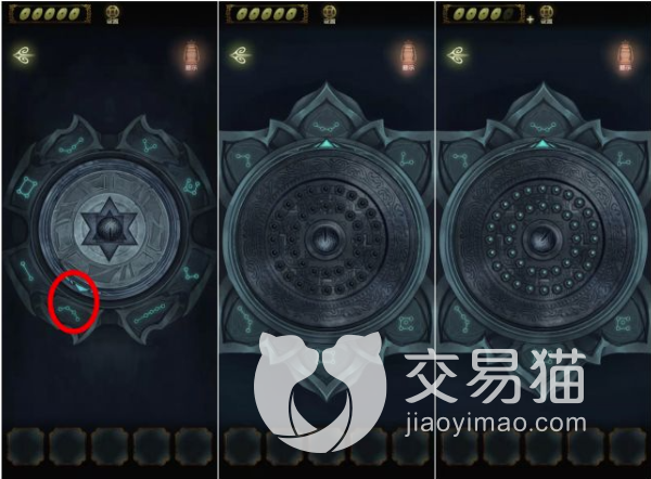 墙壁线索获得密码3485,获得铜鱼,在桌子上获得线索和道具,在猫头场景处进行解密获得铜鱼,然后在右侧的场景中获得道具打开负三层,在负三层发现地上有不同颜色的法阵,点击圆桌,进入解密场景,密码是猫16、眼04、鱼14、莲花11,获得道具。