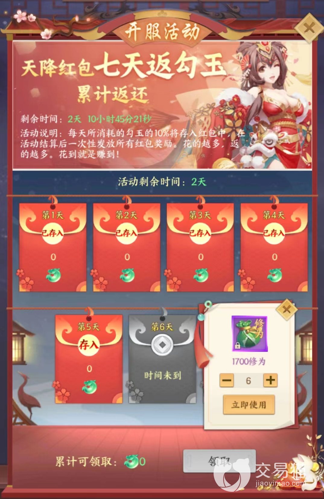 在游戏刚刚开服的前七天里,玩家只要每天存入一定量的勾玉,等到游戏里的七天返利活动结束的时候就可以直接一次性的返还给各位小伙伴,但是这里需要注意的就是,七天返利中存入的勾玉数量就是指小伙伴们在这段时间内消耗花费出去的勾玉数量,玩家们在进行消费的时候,勾玉会按照一定的比例进行积累,在这段时间内,玩家消耗的勾玉越多,后期返还的勾玉也就越多。
