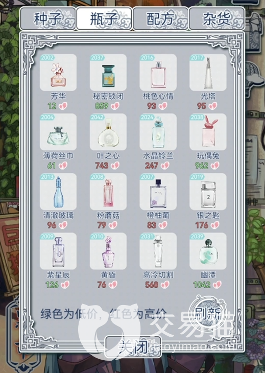 遗忘都市:油桃5份、维西利亚5份、毛茉莉5份,瓶子选择双冠瓶