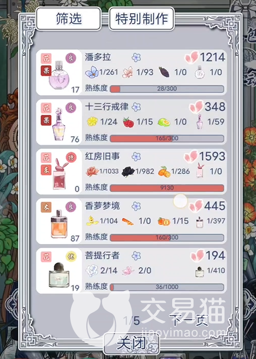 《花与香水与猫》这款游戏中玩家们需要经营一家温馨的香水店,需要根据不同的材料进行香水配置,在游戏中需要知道香水相对应的配方才能调制出相对应的香水,今天小编就为大家带来了花与香水与猫香水配方有哪些的详细介绍,为各位小伙伴们详细介绍五星香水的配方,有兴趣的小伙伴赶紧来看看吧。