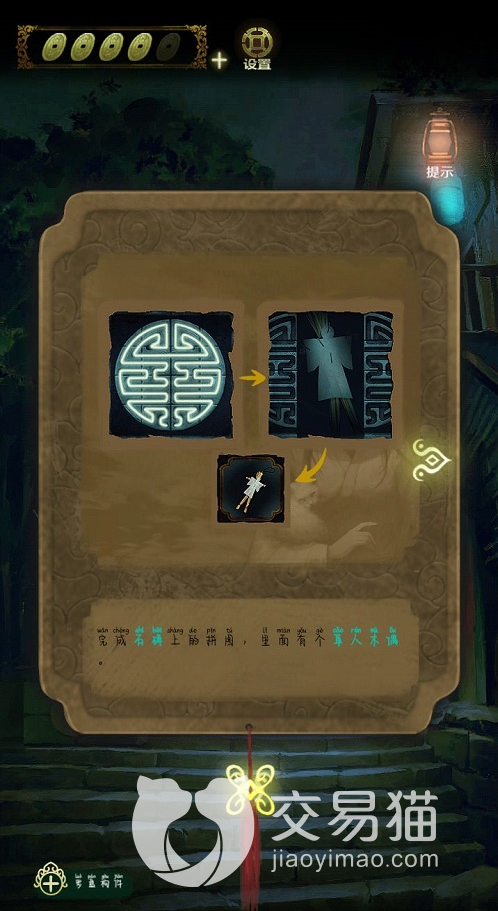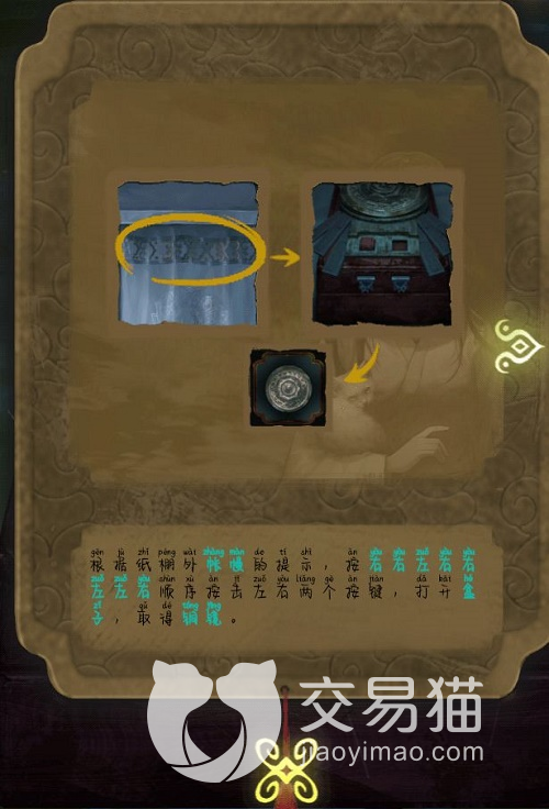 玩家在进入帐篷后在桌子上面拿到道具火折子之后就可以获得罗盘和一张纸,在桌子上还可以得到一个装满水的香炉道具,在纸上可以看见有一些字,将香炉里的水泼在纸上得到密码线索。然后在棚子地上可以看到一个炭盆,将小木偶放在炭盆上用火折子烧掉,然后可以在纸扎人的手中获得线索。
