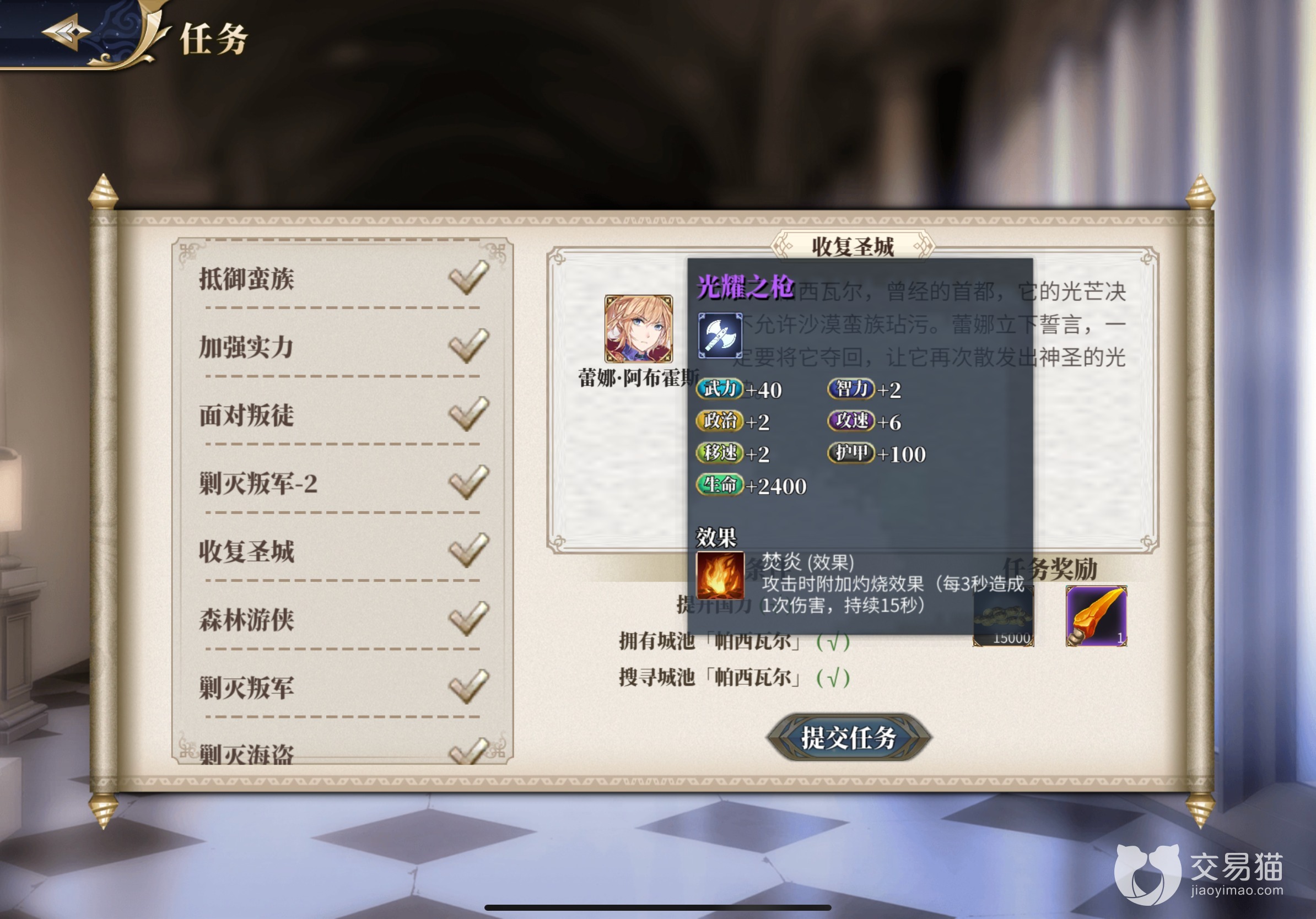 皇女的专属武器光耀之枪比起前两者稍弱一些,是紫色品级,毕竟是人类,比起幻想种族还是差点意思,但武器还加了内政属性,特效是附加额外的火焰伤害,实用还是实用的。