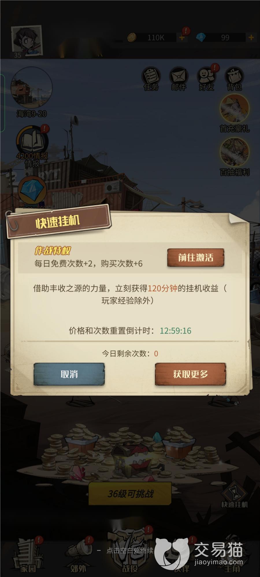 除了挂机还有一个快捷的方法也就是玩家可以点击右边的快速挂机的选项,一天两次机会可以直接获得两个小时的挂机受益,当然这个两次挂机可以让玩家升级两次,当然有财力的玩家可以购买作战特权的月卡,可以将自动挂机的机会增加四次,一天领先四级,几天就能领先其他玩家好几级,这样就能攻略更多的关卡了。