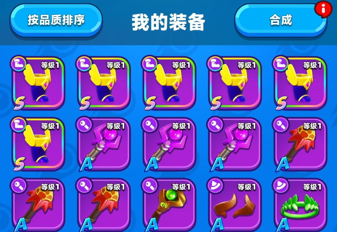 1、3个相同品质的装备可以合成一为个更高稀有度的装备,当装备品质来到紫装后,一个紫武器a需要两个同样的紫武器进行升级,升级后可以成紫武器a+1+2这样。需要特别注意的一点是,紫武器在a+2后可以继续用一个紫武器a来进行升级,升级后可以变成成金色武器a。这一点非常主要一定要多加注意,有两个重复的不要先急着升阶,可以留着后期升金用。