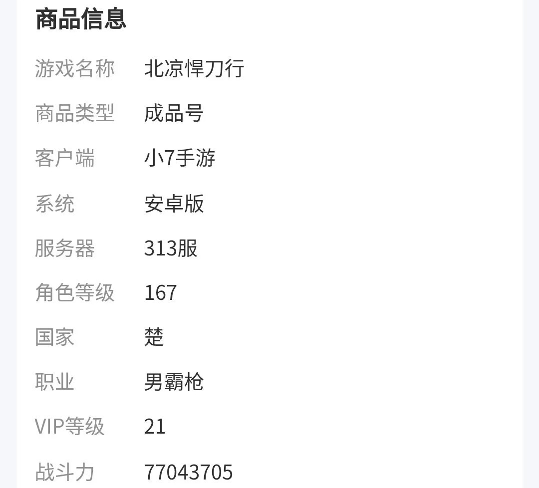 北凉悍刀行商品专区有着非常多的低价甩号捡漏系列,这里有百级神剑、霸枪、儒士等多种职业让大家选择,更详细的商品详情可以点进产品查看截图,双十八星套以及VIP等级还有战斗力值在卖家提供的截图内会非常清晰的展示出,而且在交易过程的第一个验号步骤会有专业的平台客户为大家验证真实性。