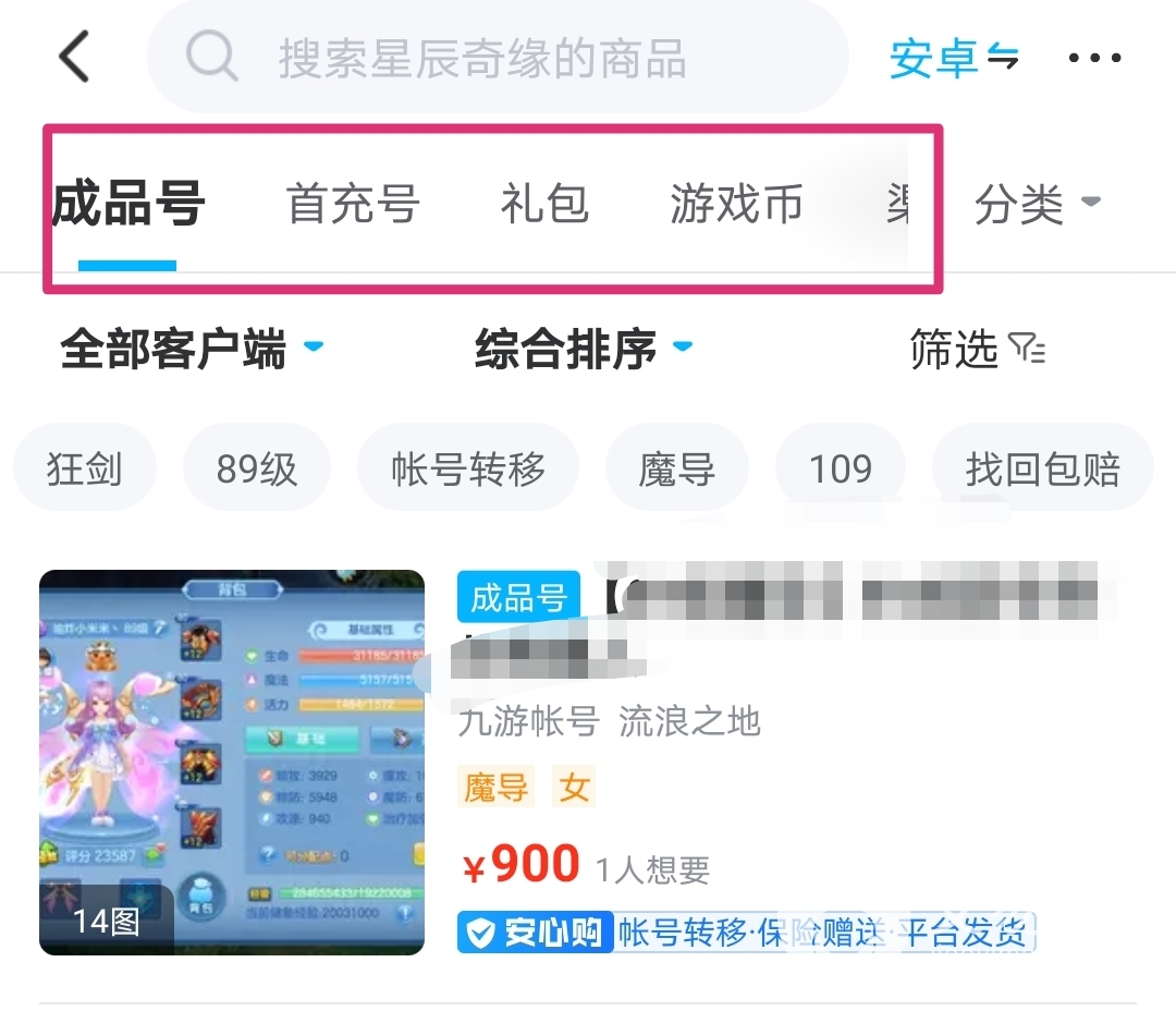 第二是交易猫上面在售的账号类型、数量都特别多,目前平台上有星辰奇缘的成品号、首充号,以及各种礼包、游戏币、渠道充值、道具正在售卖。不论你需要游戏相关的什么,在交易猫上都能买到。