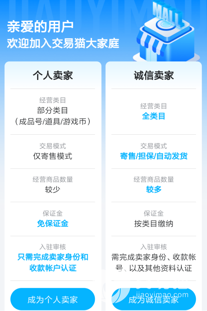 2、同时,各位毕竟需要在平台当中发布自己的交易信息,那么接下来就需要去申请开通一个卖家身份,这样才可以获得发布商品的权限。之所以会这样要求每一个想要出售账号的玩家,其实就是为了提高大家的交易质量和安全。