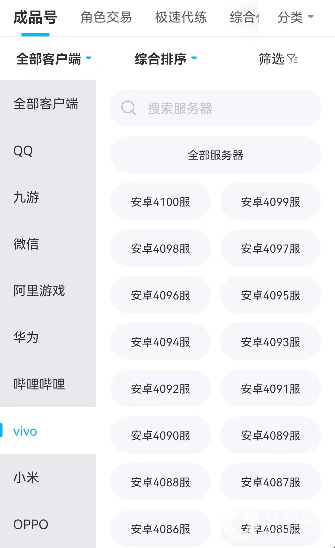 在这里要想购买vivo游戏账号非常方便,只要确定想要购买的游戏支持该客户端,就可以开始查找。因为游戏账号在上架的时候就已经提前注明了所属客户端,所以这里有直接选择功能。在对应专区中可以看到有全部客户端选项,在其中找到vivo,就能看到有所有该客户端下的服务器。可以选择指定一个服,也能够直接全部选择,这样所找出来的就都是符合要求的内容。选中之后购买的流程和方式与其他客户端完全相同没有任何区别。