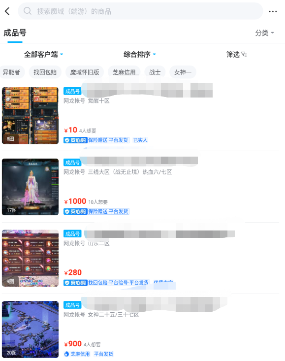 一、多种优质账号,商品服务类型众多。交易猫平台上面有大量活跃的魔域游戏玩家,不管是魔域的端游手游还是口袋版,都能找到专属的游戏专区,选购账号非常方便。各位用户点击相对应的游戏专区,可选择筛选账号等级、价格区间,大量150级优质高战力账号,挑你喜欢。