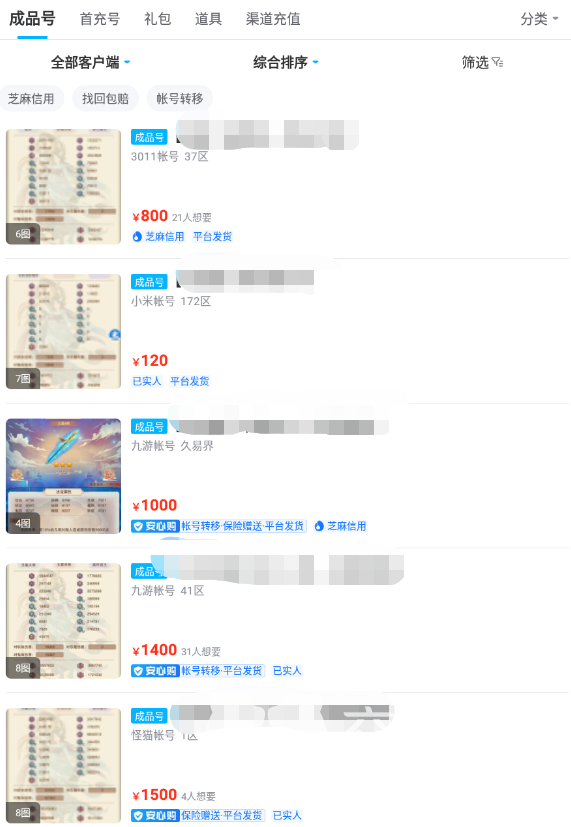 一、账号便宜,可选类型众多。因为交易猫是国内比较大型的游戏账号交易平台,人气很高,吸引大量的想不想修真游戏玩家入驻,所以买号选择的余地很大。玩家搜索“想不想修真”点击进入游戏专区,即可看到,各种不同价位的成品号、首充号以及礼包道具等,新区老区各种服务器应有尽有。