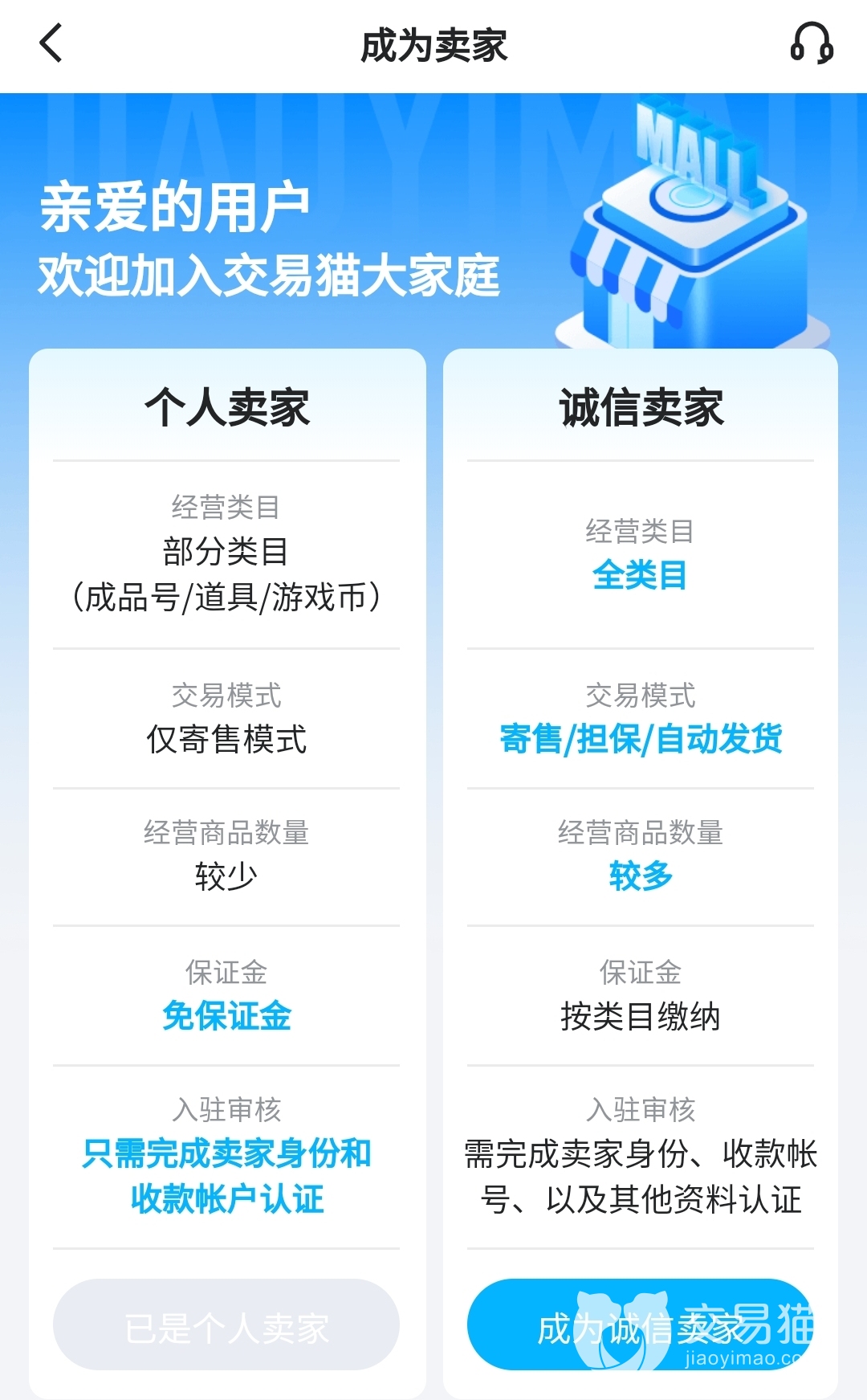 交易猫软件提供两种卖家认证方式,小伙伴们可根据需要选择,这一点设计得十分人性化。个人卖家认证流程简洁,当然可出售的商品类型也少。诚信卖家销售范围广,那自然门槛要高一些。一般用户出售账号,申请成为个人卖家就足够啦,无须缴纳保证金,填好商品信息后就能上架。