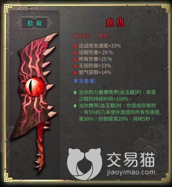 血仇这把武器好就好在会增加33点攻击速度,岁然别的武器也增加攻速,但自然达不到这个数值,带这把武器需要配合装备血玉髓,因为会增加玩家的伤害和防御,以及邪恶之眼的持续时间,直接增伤的触发条件基本没有什么额外要求,值得一用。