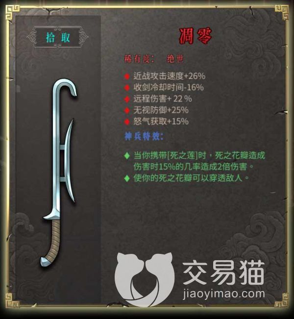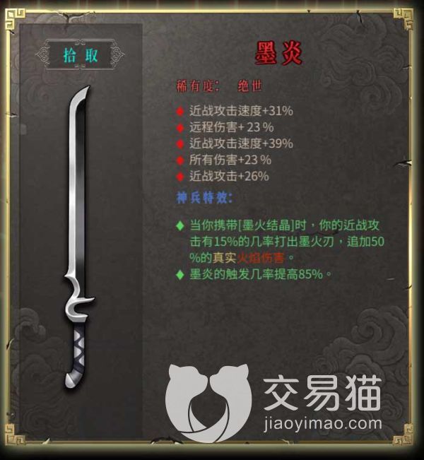这把强度高就高在携带墨火结晶时,近战进攻有几率打出额外的真实伤害,另外一个是增加触发几率,这个效果也很直接,总之来说是一把输出稳定的武器。