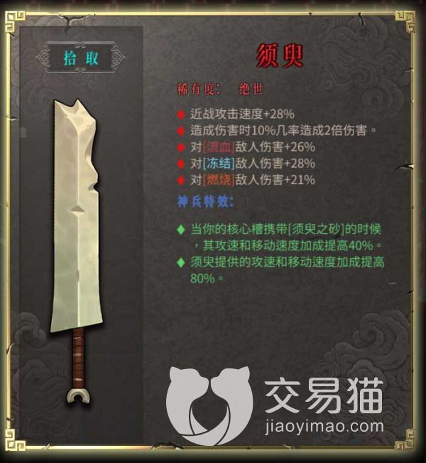 这把武器就是增加攻击和移动的武器,会让你变得很灵活,并且对异常状态下的敌人增伤,以及10%的双倍伤害加成,用途广泛,玩特效流的话可以尝试这把武器。