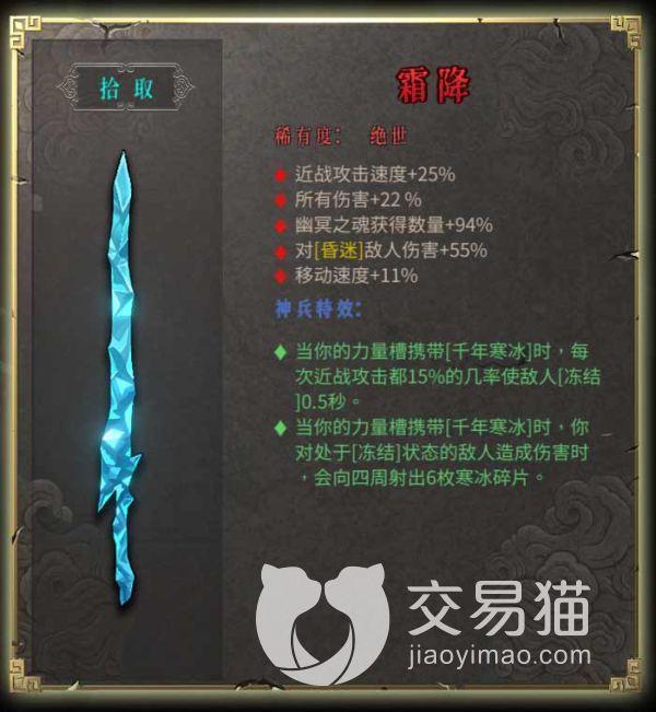 这把武器不增加远程伤害,所以推荐近战可以使用,这把武器可以在携带千年寒冰的情况下,冻结敌人,冻结其实在游戏里也算一种昏迷,所以可以吃到昏迷状态下增伤55%的加成,此外打冻结的敌人还会发射碎片造成AOE溅射伤害。