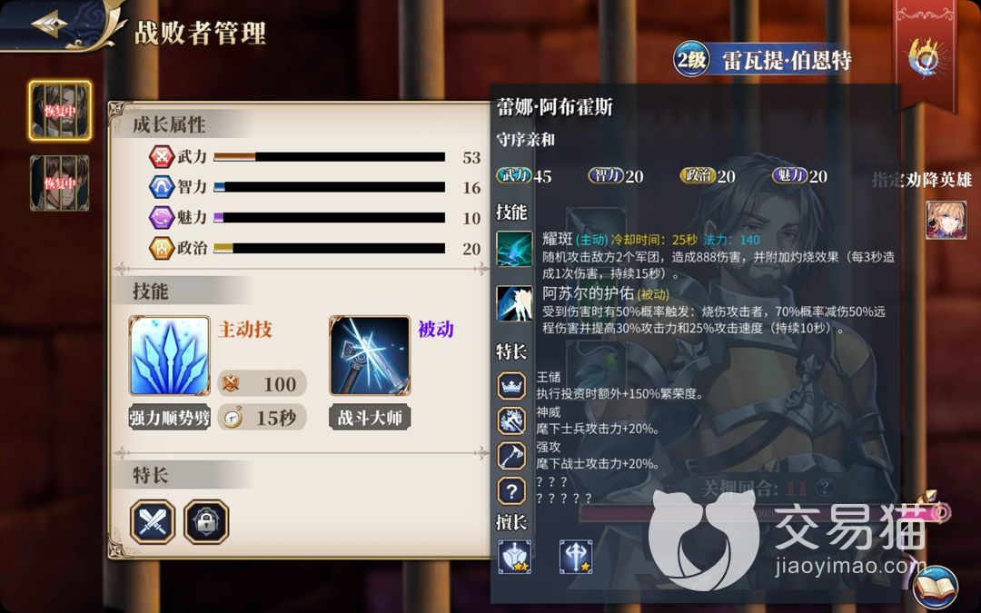 还有些情况就是强者劝降弱者,如果你负责劝降的英雄装备好属性高,那对被劝降者的影响还是比较大的。