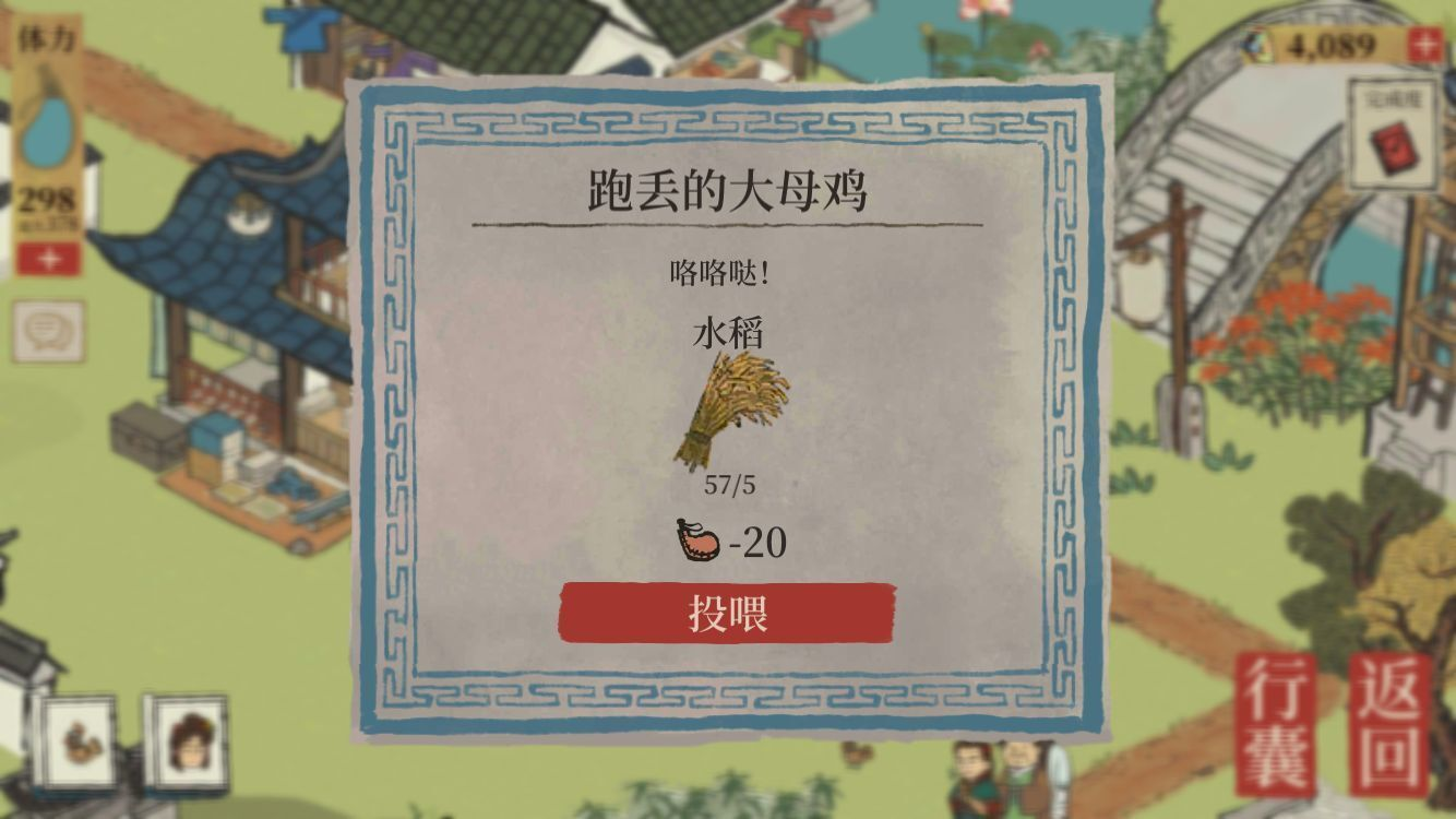 玩家们在接取顾大娘的任务之后需要帮忙喂养五只鸡,每只鸡需要玩家消耗五份水稻和20点体力。