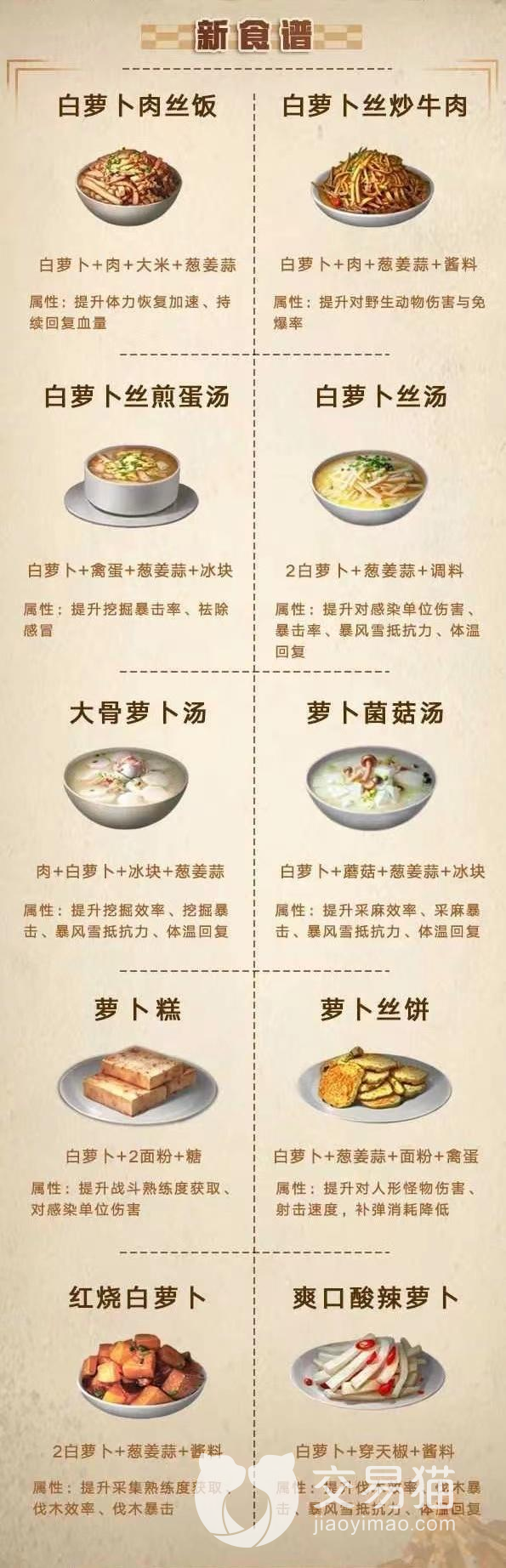 好了,以上就是小编尽可能提供的所有数据了,这下大家都目睹到了明日之后食谱大全一览了吧。如果本篇对您有所帮助的话,可以多多关注我们的交易猫平台,我们后续还会更新更多的攻略文章供大家来参阅哟。本篇就写到这里,咱们下篇再见吧。