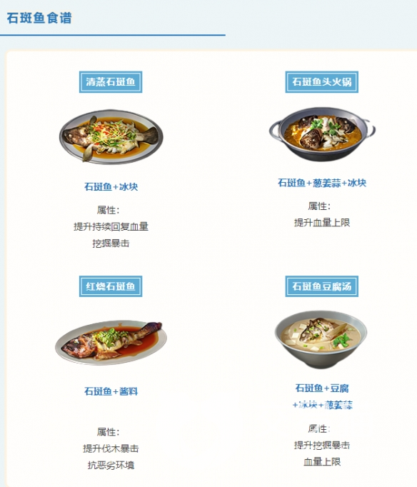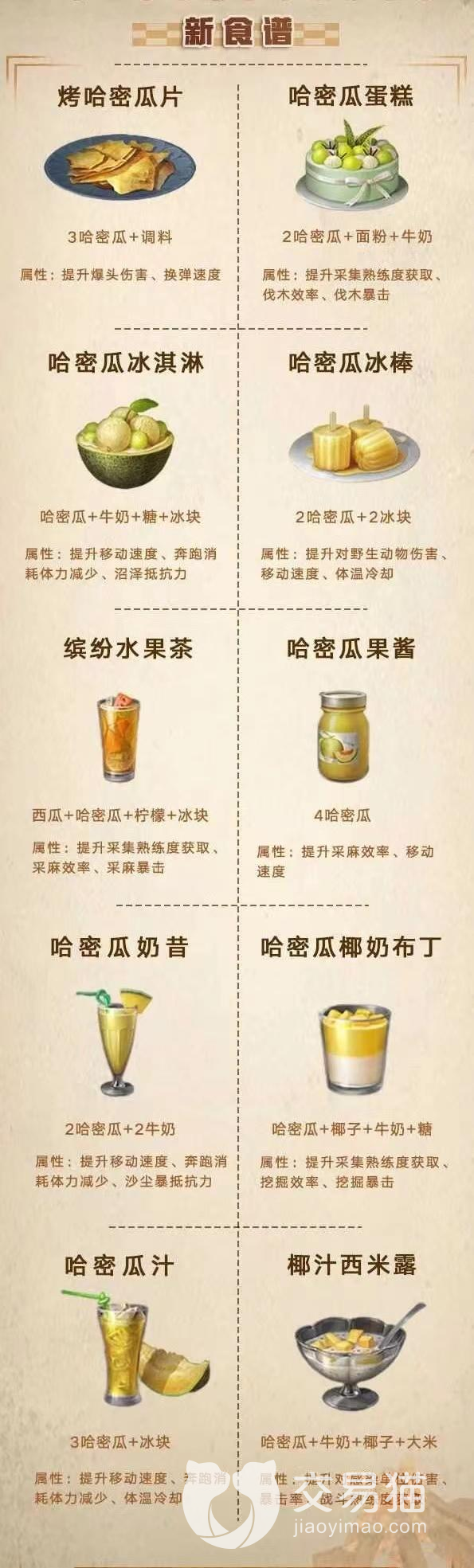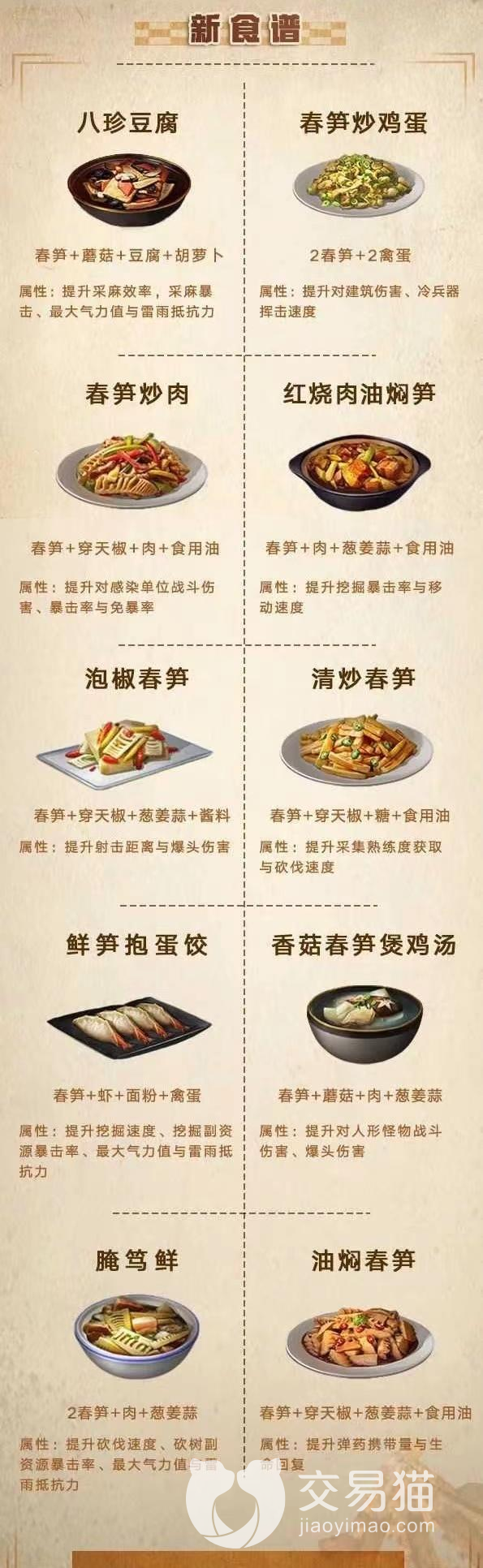 最后剩下的就是新食谱,新食谱的属性增幅方面主要都是全能型的,应付各种各样的环境都有,例如针对采集提高效率的,也有针对战斗属性提升的等等。