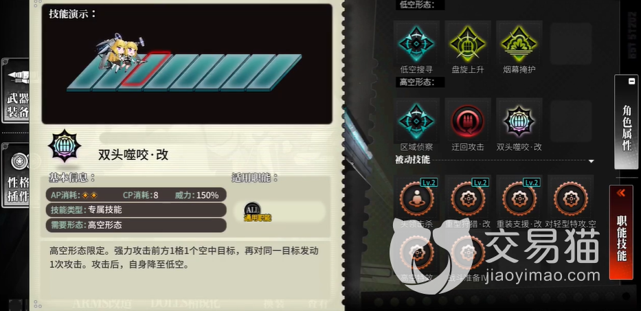 和之前两个偏向战斗的角色不同,她的定位更多是侦察,一技能效果是击杀敌人时会大幅提升伙伴的暴击率,不过这个暴击加成的范围局限大,需要是伙伴和自己是同阵营才能触发。二技能提升火力,三技能提升贯通,不过都有前提。专属的话是个两段式单体伤害技能,放完之后会切换低空形态。