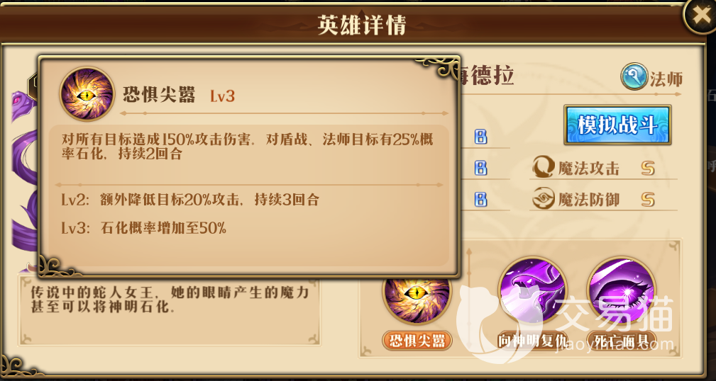 海德拉的话,其定位是躲在后面的法师,阵中的伤害输出并不依赖她,但需要她的技能提供石化,从而为友方C位创造输出空间。