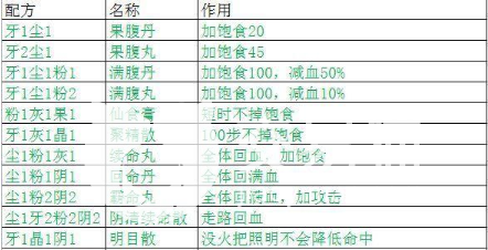 果腹丹:是其中常用的丹药,加饱食度,需求量大,利用1牙、1尘即可制作。