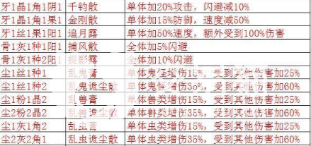 千钧散:这个丹药主要为单体角色使用,能够为角色增加百分之二十的攻击数值,闪避也可以减少百分之十,制作材料耗费较多,需要1牙1晶1角1阴来制作。