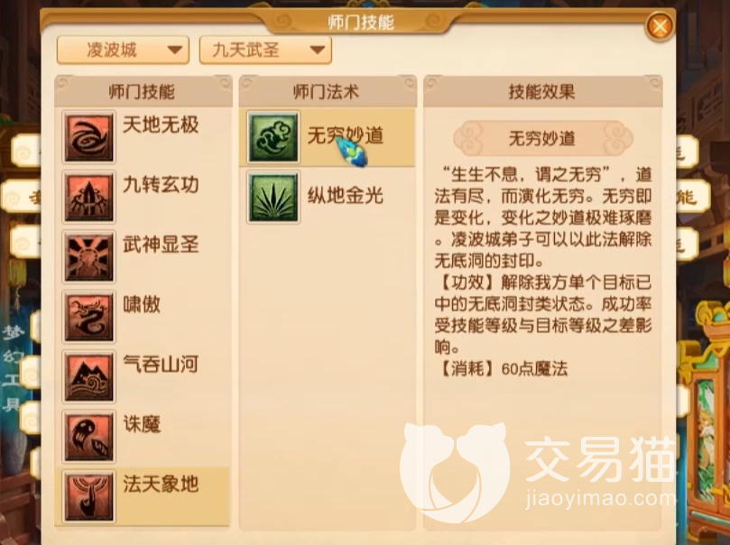 它里面同样有两个技能,前者可以解除己方单体目标的无底洞封印,后者则可以立刻传送回门派内。