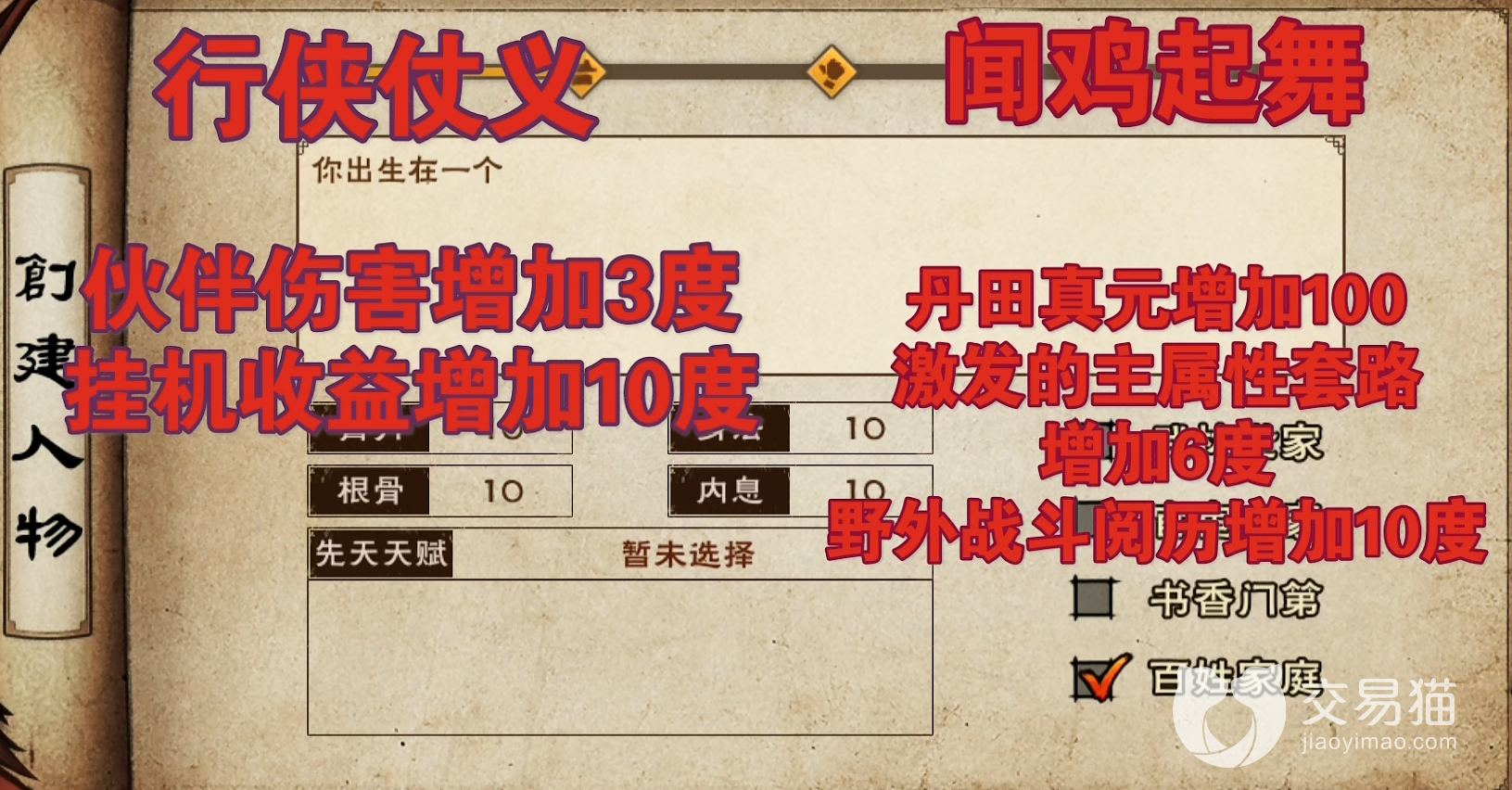 在进入这款游戏的时候,会让玩家选择初始天赋,有“行侠仗义”“酷爱兵器”“跋山涉水”“闻鸡起舞”和“妙手空空”,这里小编建议大家选“行侠仗义”,它可以让伙伴的伤害和挂机的收益进行增加,比较实用。
