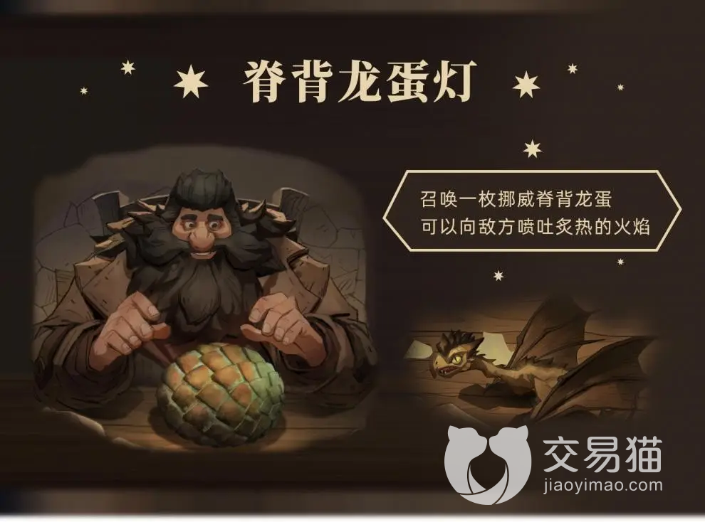 挪威脊背龙蛋:玩家们在使用该卡牌之后就可以召唤出一枚龙蛋,在龙蛋生命值回复到满值之后,就会破壳出来一只幼龙,这个时候幼龙会随机对敌方单位造成三次范围性的火焰伤害。