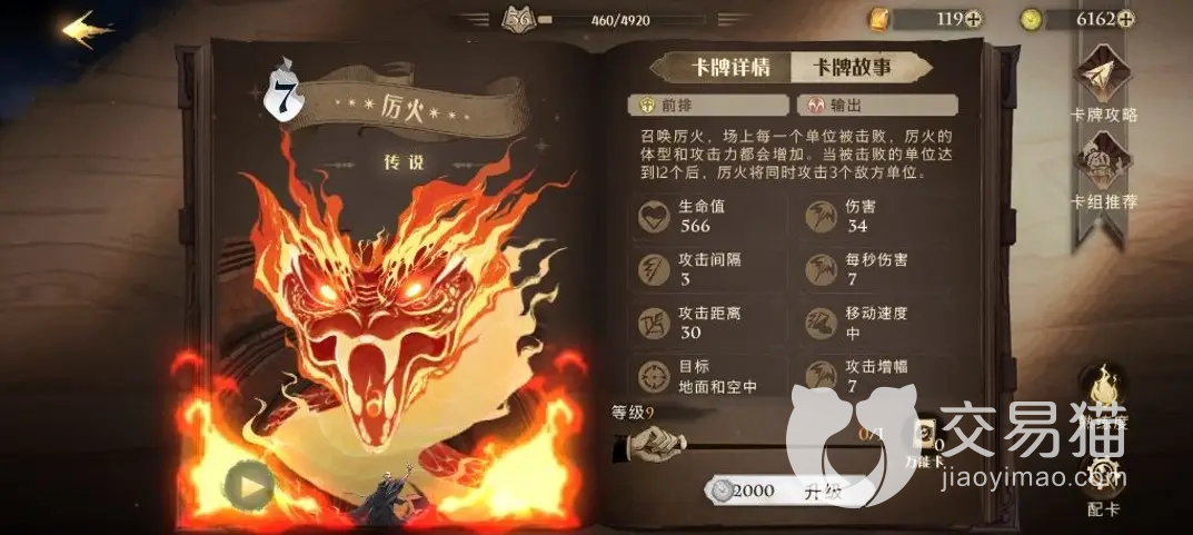 厉火:在使用该卡的时候,场上每消灭一个单位就可以增强厉火,当消灭掉2个单位之后厉火就会对敌方三个目标单位造成伤害。