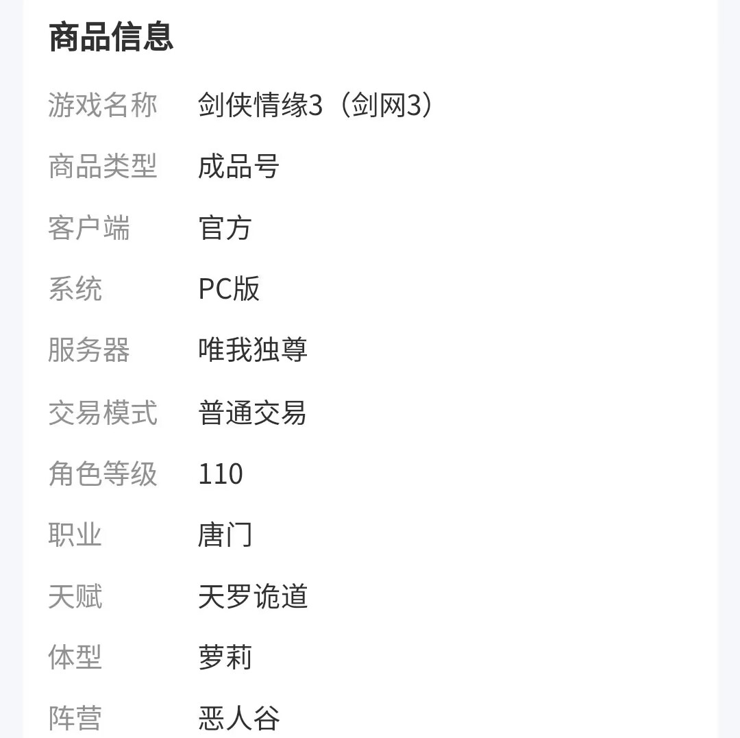 最推荐的估价方式仍然是在交易猫平台内将自己的账号亮点输入在剑网三商品框栏内,平台的搜索引擎会呈现出同样职业、同样天赋、同样体型以及同样阵营的账号,和大家的账号条件基本类似程度达到50%以上就可以参考该卖家的定价,为自己的账号进行价值估测。另外大家可以筛选一下服务保障中符合平台已验号条件的,里面的物品截图也是重要的估价标准。