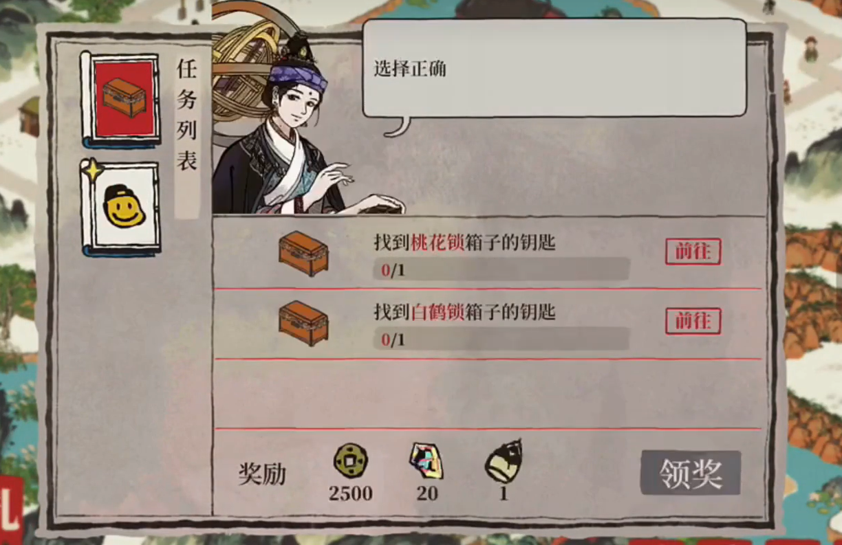 在完成【游鱼锁箱】的任务时候需要在营造界面中进行调查该任务的详细线索,然后找到相对应的丰年钥匙,然后需要玩家们依次搬出箱子:桃花锁箱子、白鹤锁箱子。这些箱子想要打开需要使用相对应的钥匙,桃花锁箱子对应着百花钥匙,白鹤锁对应着祥云钥匙。