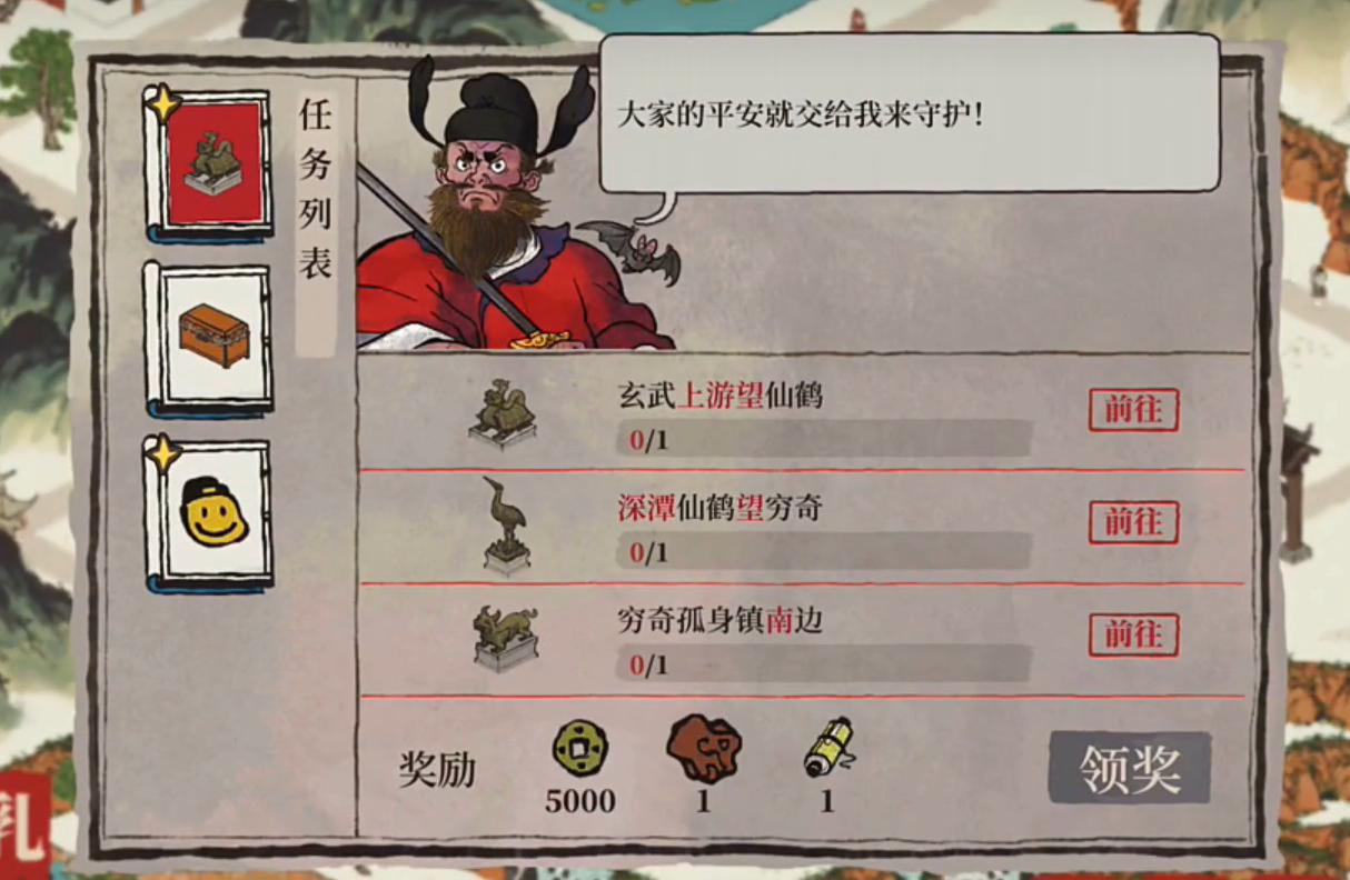 【铜像镇守】的任务需要玩家们根据游戏中给出的详细提示,分别将穷奇、仙鹤和玄武放置在任务指定的位置,玄武就放置在石桥右边的水池正中,穷奇放在瀑布下方,仙鹤就放置在地图的右下角,需要注意的是,仙鹤和穷奇需要玩家们调整方向。