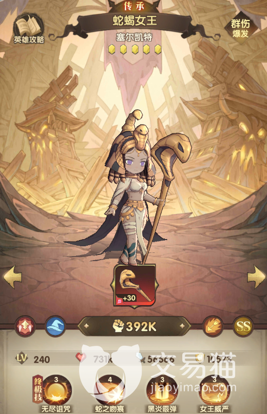 最后是有蛇蝎女王、炼金术士和时空旅人等组成的队友,主要的输出为蛇蝎女王——塞尔凯特,她可以对直线范围的所有目标造成300%的伤害,且附带debuff,然后其他角色的主要作用就是将其保护起来,让她有更好的输出环境,所以玩家可以再搭配上手上养成的比较好的防御角色。