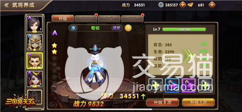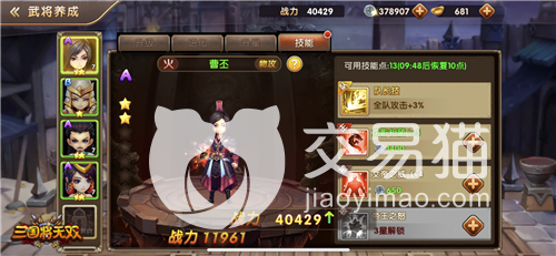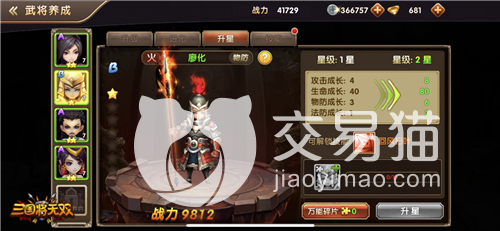 然后升完级以后,还想要武将的战力提升更高,就可以将其进行进化,让武将的品质得到提升,并且还可以将其进行升星,不过这个需要收集一定的碎片后突破才可以,越好的武将越不容易升星,但我们还可以将其的技能进行提升,让他们的属性面板数据变得更好,技能全部解锁以后,武将的伤害可以说是提升了一倍,非常强势。