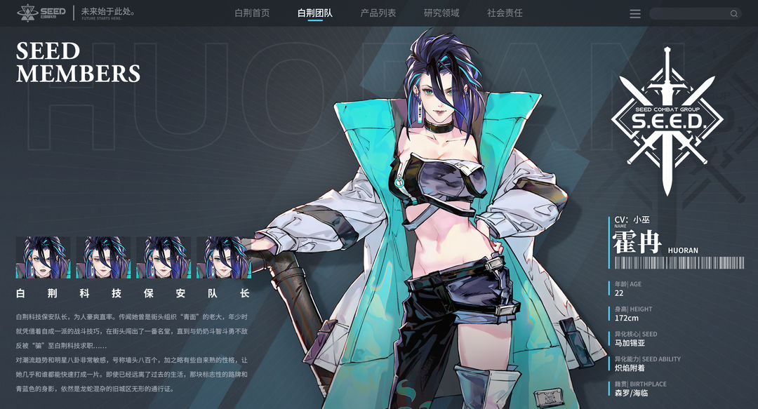 保安队长霍冉,很酷的女性,曾是某街头组织老大,拥有自成一派的格斗技巧,会在游戏里成为玩家的战斗伙伴。狄砚,外勤行动队队长,温柔少女,但战斗上非常专注和勇敢,同样是异核能力者。