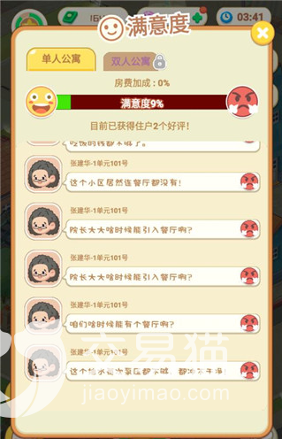 已经入住的住户每天都会有一些要求和意见,这个时候,玩家一定要注意尽量满足他们的诉求,提高她们的幸福度,毕竟在游戏内,玩家们获得的报酬奖励与住户的幸福度是相挂钩的。