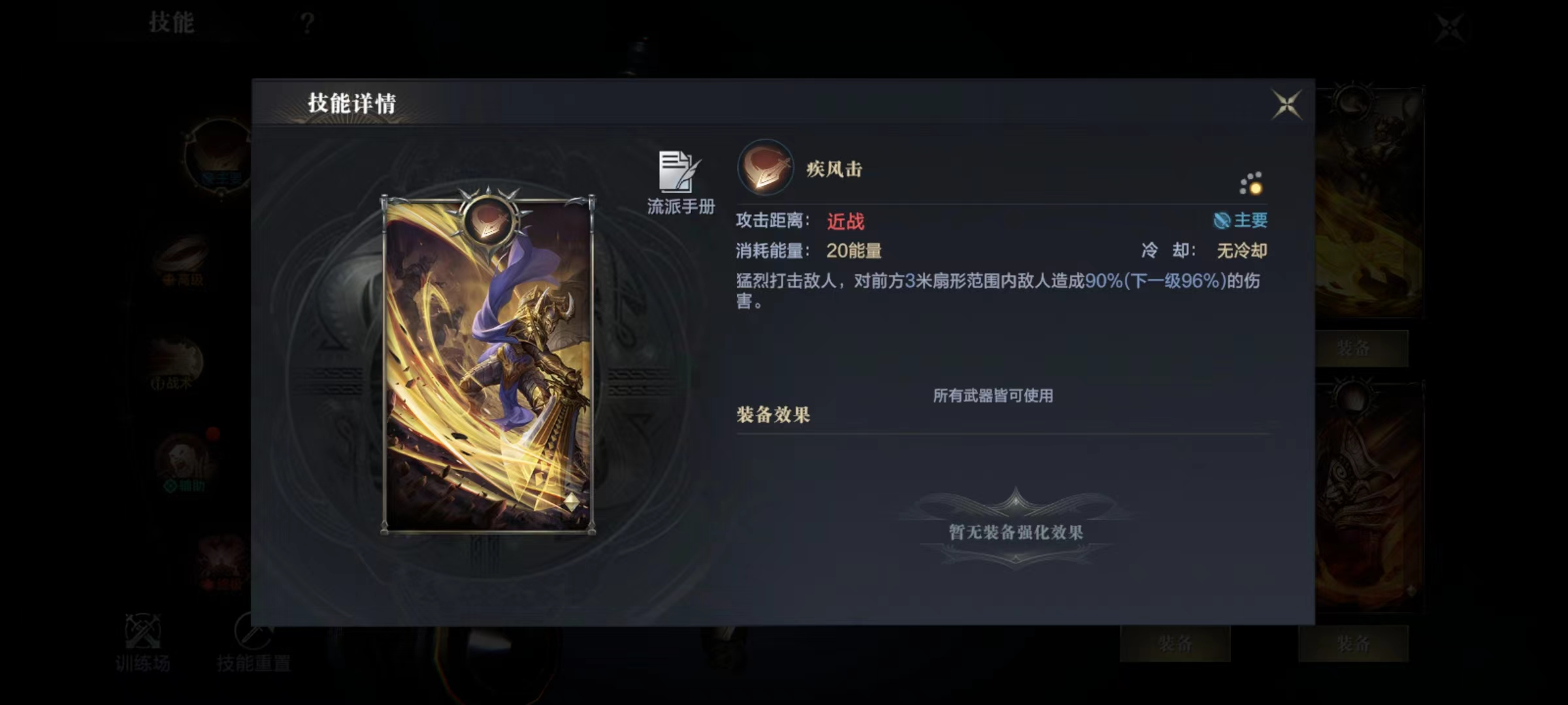 战士的主要技能推荐选择疾风击或是横扫,这两个技能都是当前热门的选择,其中疾风击可以对前方扇形范围内的敌人造成猛烈打击,攻击范围比较远,横扫可以对周围敌人造成群体伤害,命中敌人数量越多伤害还将获得提升,都是很好用的输出技能。高级技能中回旋斩是非常出色的一个,使用之后持续施法对周围敌人发动多次攻击,命中敌人时还将获得少量生命值回复效果。尤其适合在副本中刷大量小怪的时候适用,几乎可以做到无伤清理。