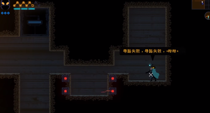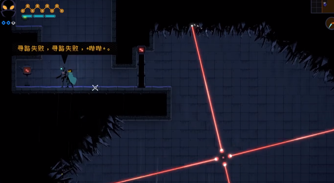 北站地图有两个机器人,其中一个在需要多次向上冲刺,并且要通过钩爪来摆荡的场景中。第二个则在地图上可以看到是个竖条矩形的房间,左上角位置就有了。这里和存盘点显示在一个房间,通过这里就可以从高处落下,回到原来的地面了。