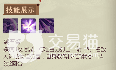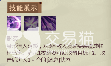 一技能影袭可以对敌方最多三个目标造成突袭,并且消耗一枚暗器的话可以突袭四个目标,在这之后会直接进入调息也就是不能攻击的一个状态,但尽管如此该技能的爆发还是很高的。