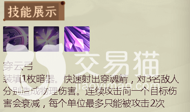 三技能穿云弓会打一轮速射爆发,不过连续击中一个敌人的话伤害会衰减,最多可以同时击中三个目标,造成可观的物理伤害。聂隐娘可以说是纯粹的持续输出流灵师,没有控制和保命,所以这次需要玩家来辅助她,以确保不会倒下。