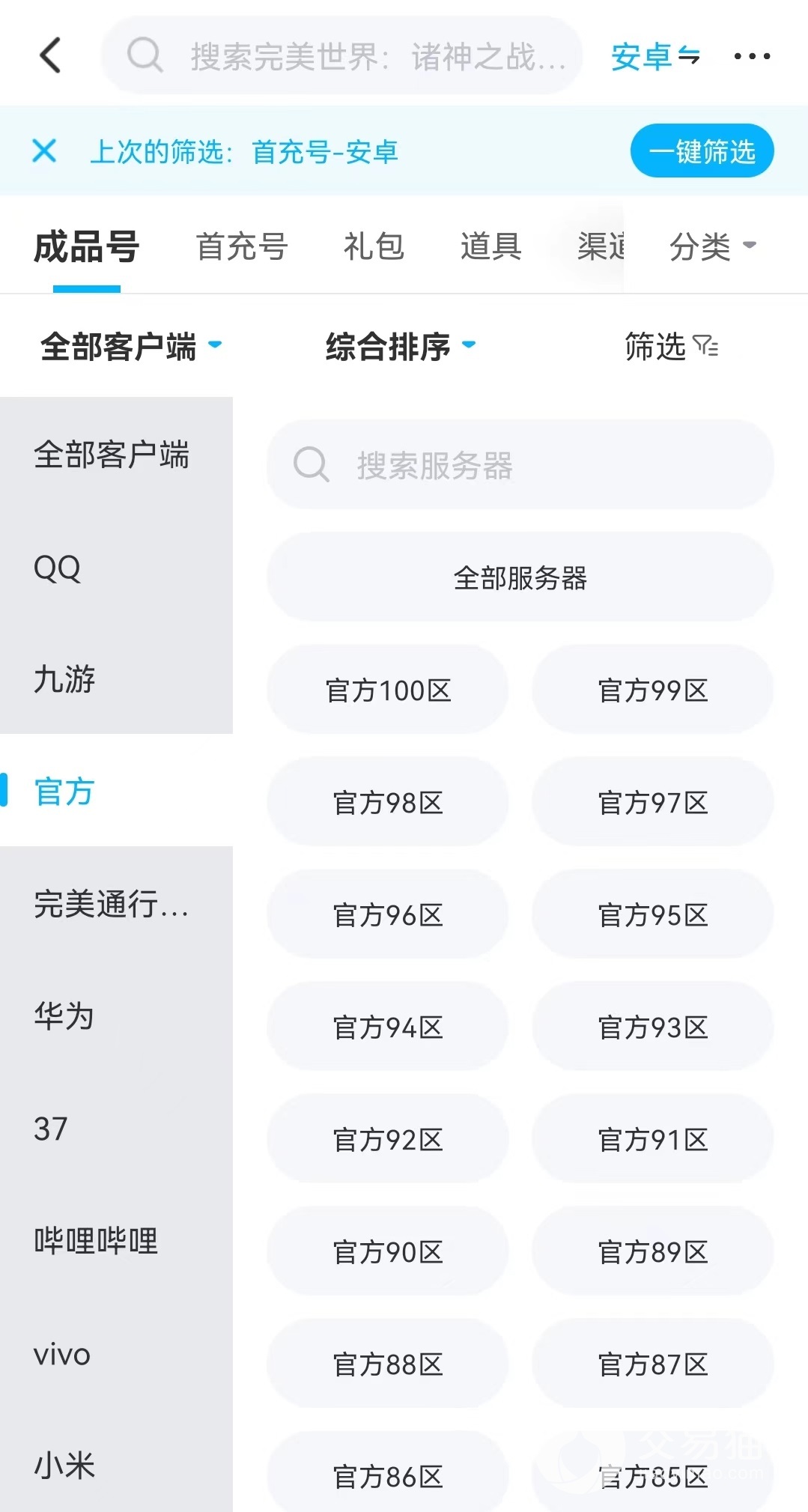 完美旗下的多款手游都可以在交易猫游戏账号交易平台中找到对应专区,丰富的可选择性是平台很重要的一项优势。而且针对完美旗下的所有游戏,都有多个不同的客户端可以选择,在手游中除了完美官方服务器之外还有很多渠道服,例如九游、华为、QQ等。在交易猫中就可以非常轻松的实现不同客户端的购买,如果想要买到完美官方账号,直接在游戏专区中寻找对应内容就能筛选出来。