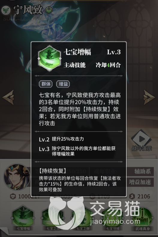宁风致的话在阵容中的作用也很大,它的定位更多是一名提供增益的工具人,不过他的增益幅度还是很大的,升满级以后,可以给全体友军提供足足百分之二十五攻击力的加成。