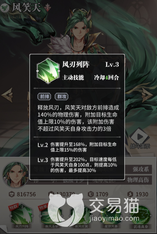 这套阵容的核心就是风笑天,他对于敌人前排的杀伤力是很强的,虽然基础的伤害加成只有百分之一百四,但会附带敌人生命值上限百分之十的伤害,而且通过升级后,这个伤害数值还会进一步提升。